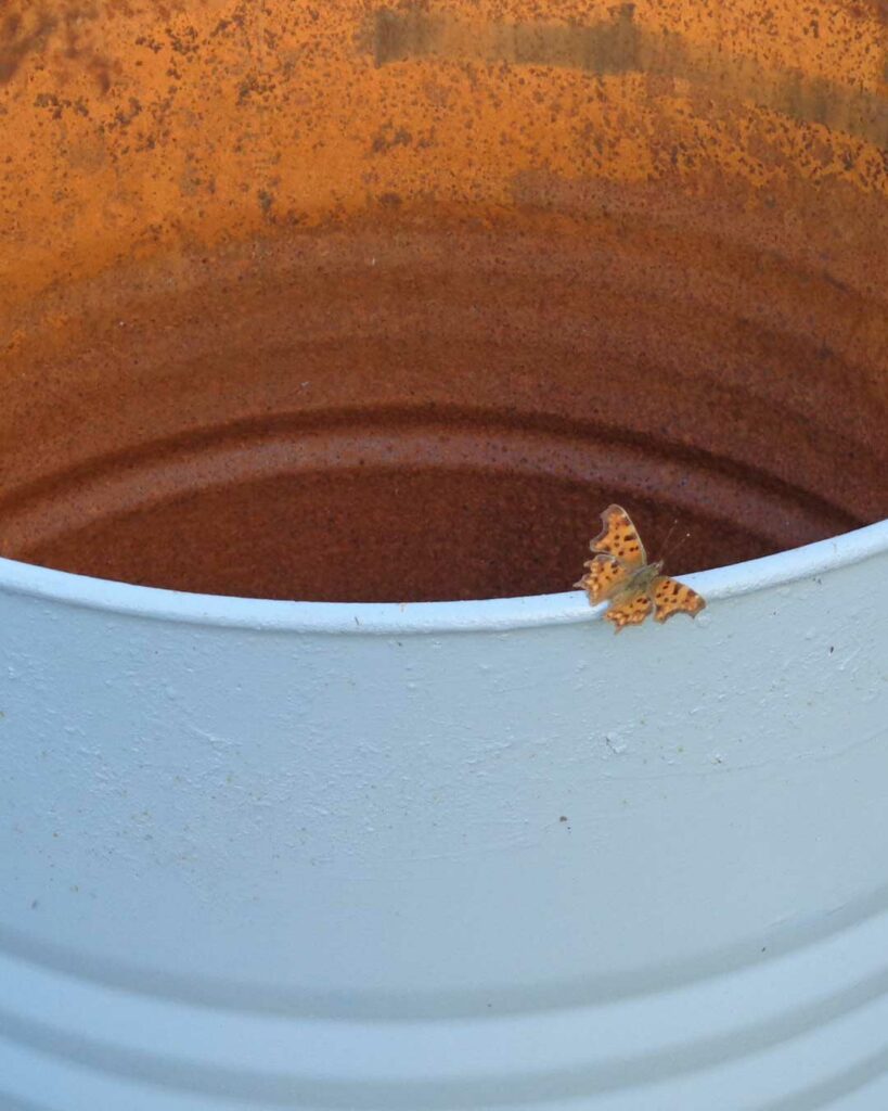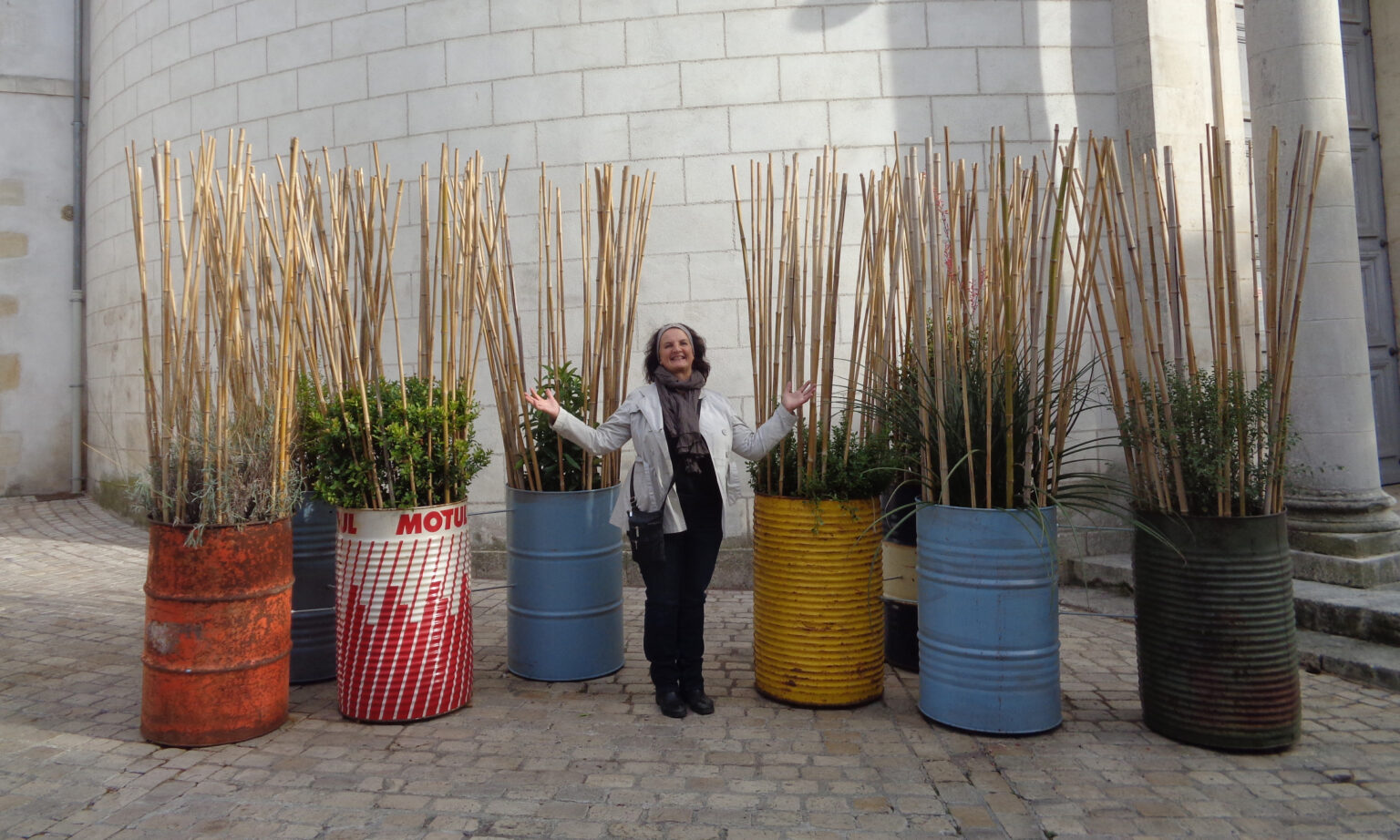 On aura plaisir à aller observer la variété des plantes proposées et admirer la beauté des contrastes entre la structure sèche des tiges, et les coloris de verts différents formant un camaïeu, qui s’opposent également à la matière burinée des bidons.